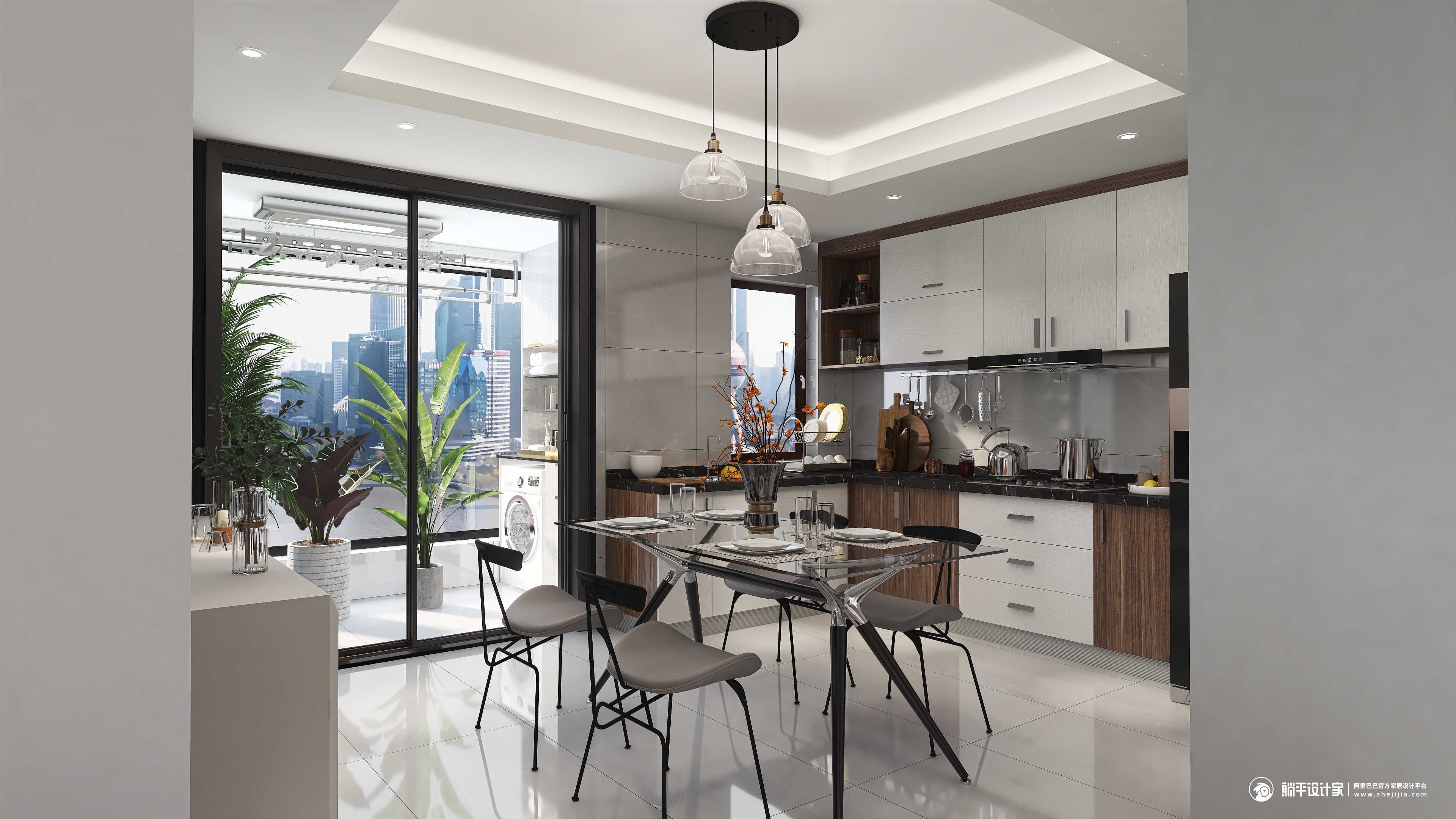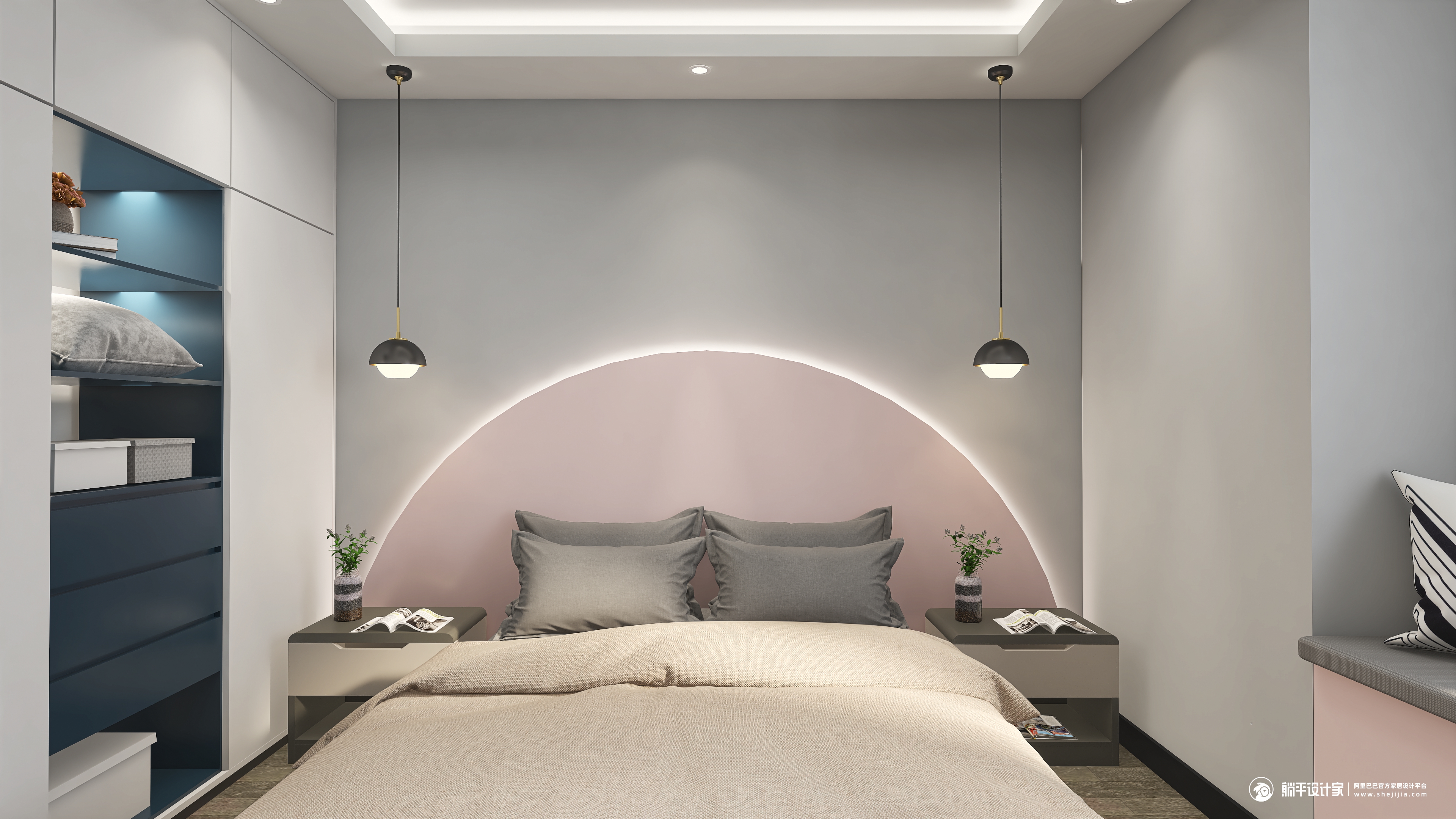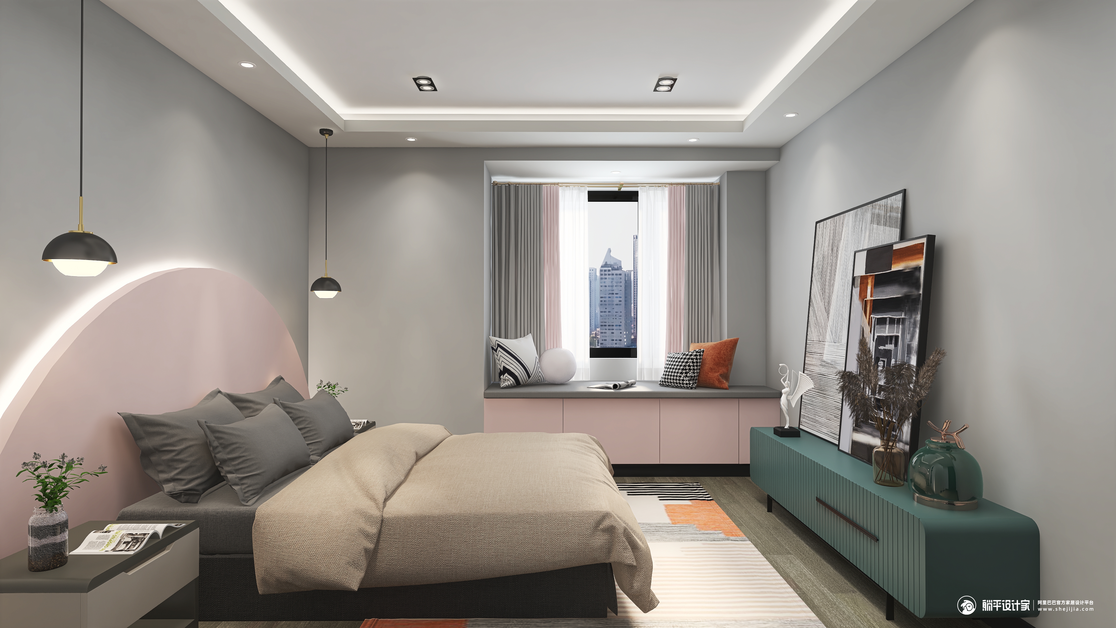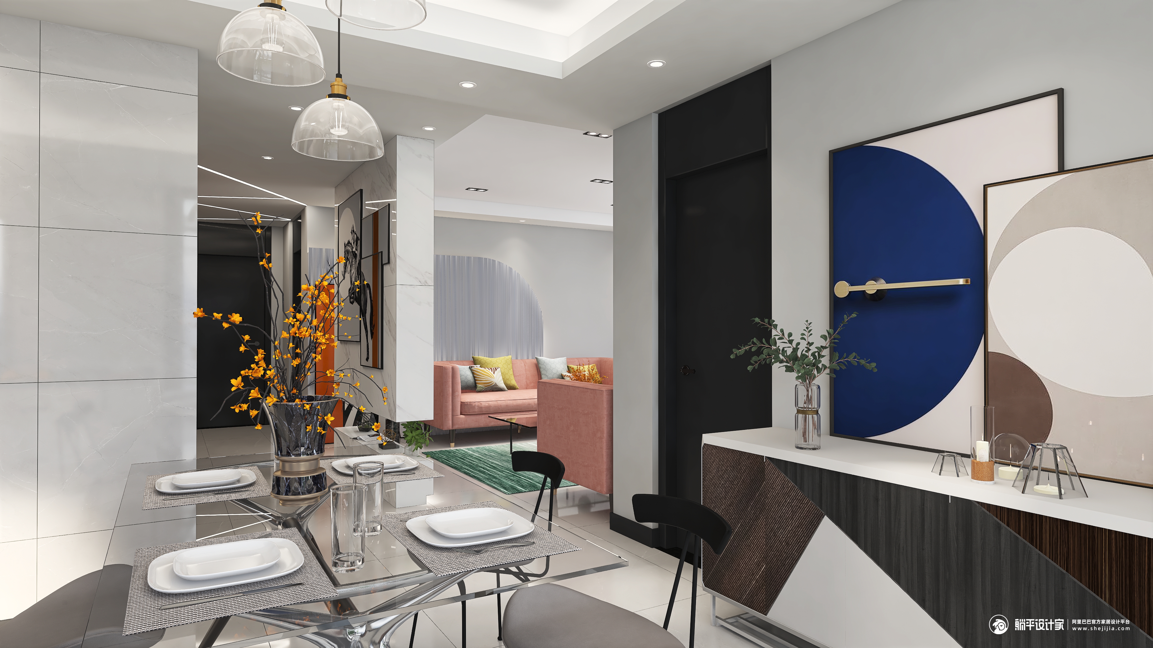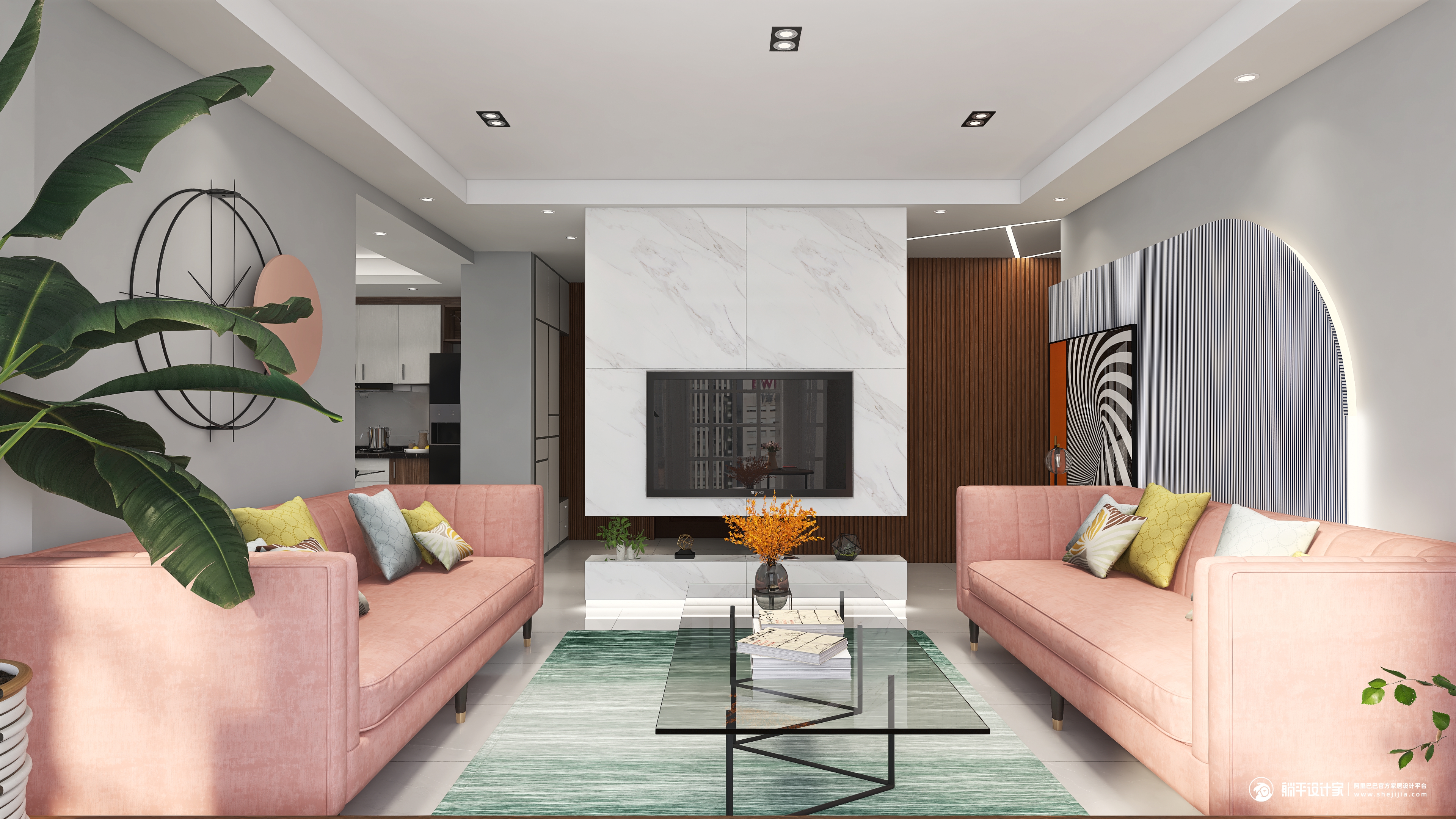 本案设计是现代简约风格,结构上没有过多的改造,墙面也没有过多复杂的造型,选择了永不过时的经典色高级灰,过道胡桃色的造型设计和客厅的木地台相呼应,为了增加空间的活泼性,选用了亮色系的沙发,而绿色的地毯和粉色的沙发形成了对比,但是让空间更有层次感,而餐厅更是以简约为主,干净的玻璃餐桌搭配有线条感的椅子,开放式厨房与餐厅融为一体,空间不大却不觉拥挤,整个空间打造简约而不简单。