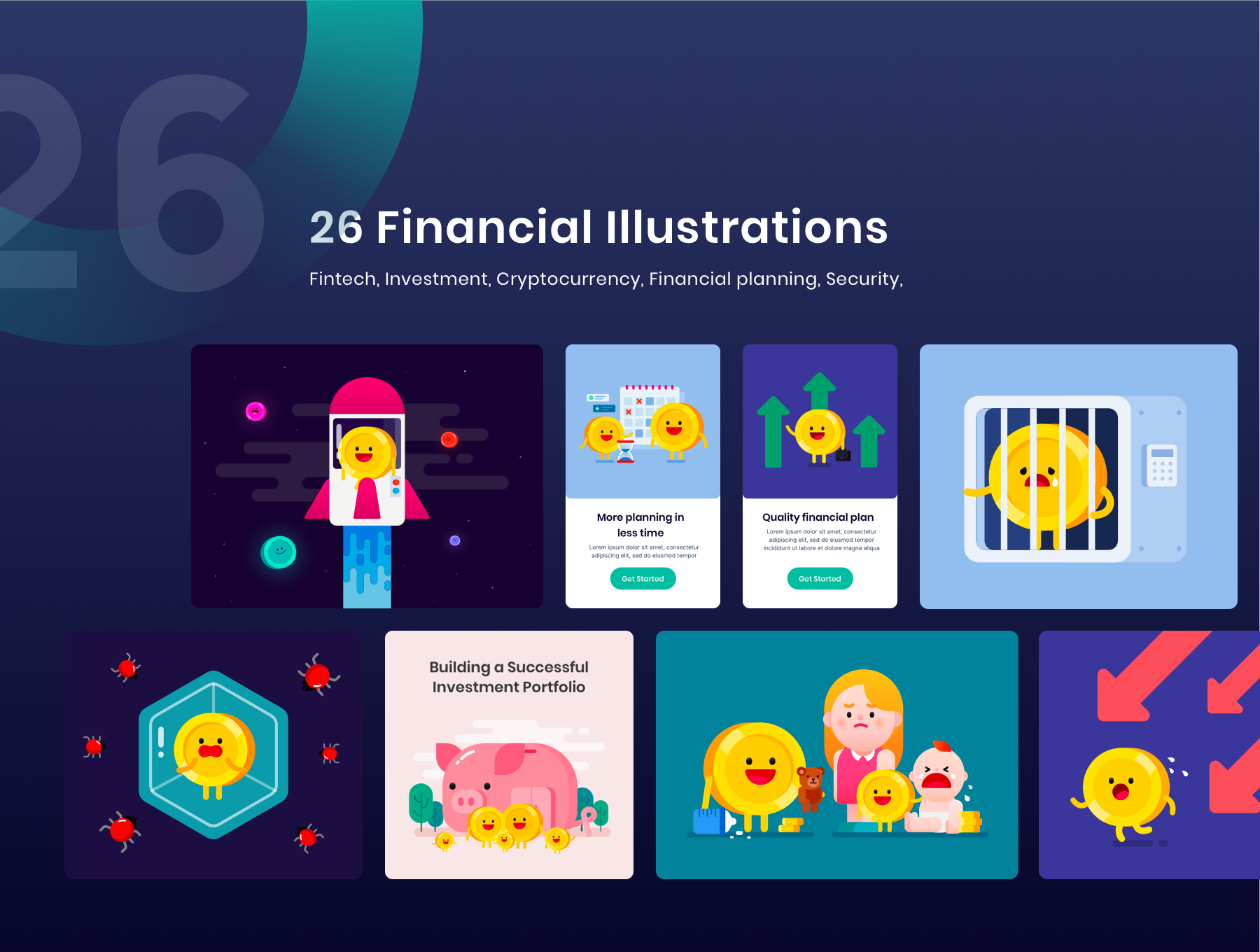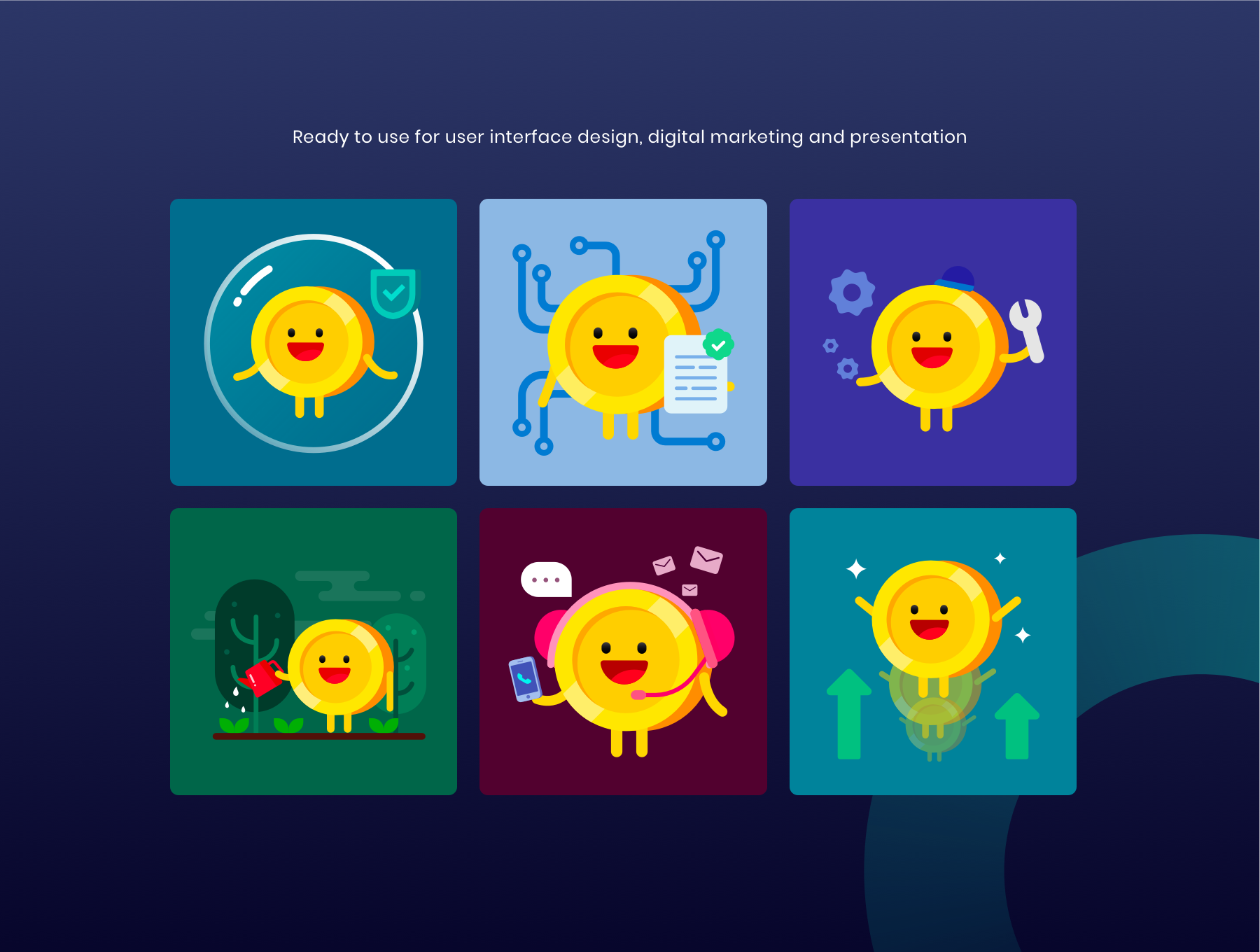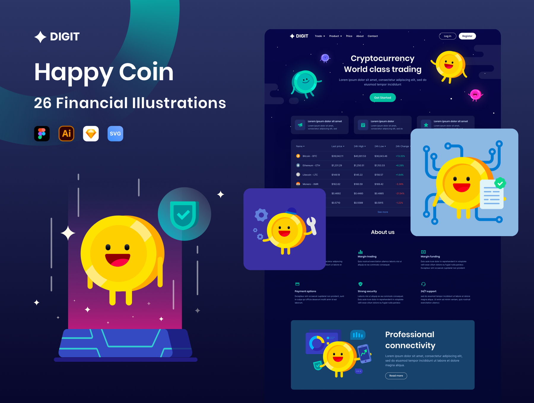 Digit Coin 插图包包含 26 个精心制作的场景,带有丰富多彩的可编辑矢量图,可用于网站、移动应用、数字营销和演示。